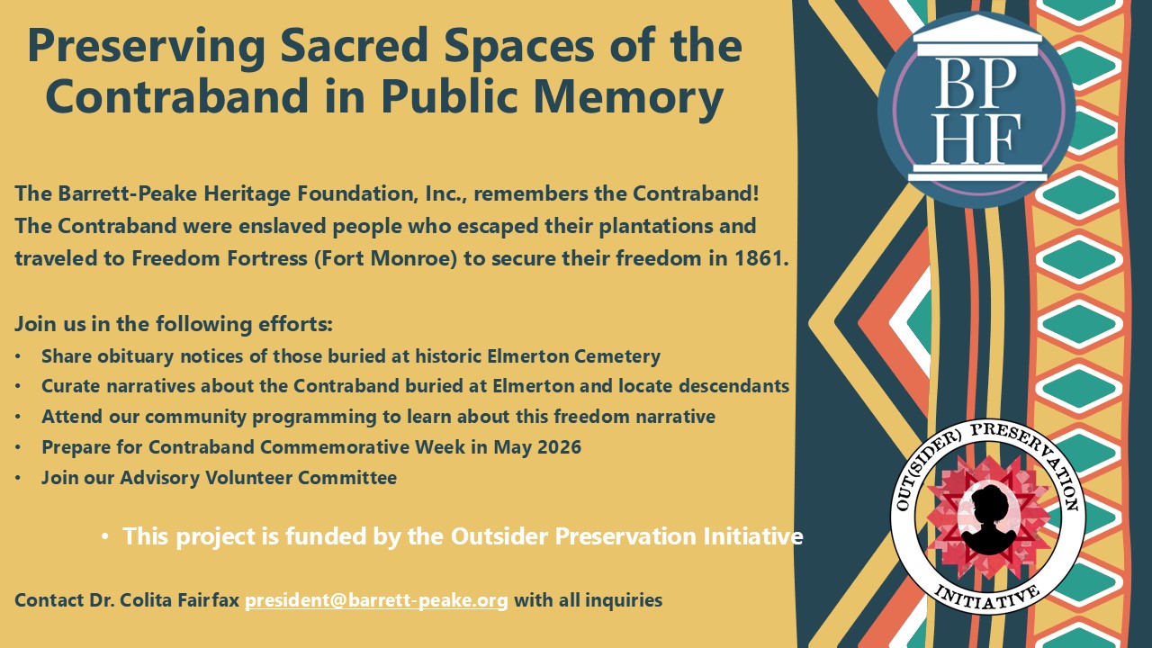 The Barrett-Peake Heritage Foundation envisions preserving historic sites and venues in the city of Hampton, by upgrading and securing signage for historic cemeteries and develop new educational and cultural initiatives at the former Virginia School for Deaf, Blind and Multi-Disabled at Hampton.