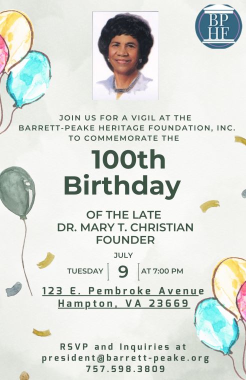 On Tuesday July 9, Barrett-Peake Heritage Foundation gathered at our headquarters, the Hampton home of the Virginia Federation of Colored Women's Clubs to commemorate the 100th birthday and celebrate the life of our founder and guiding light, Dr. Mary T. Christian.